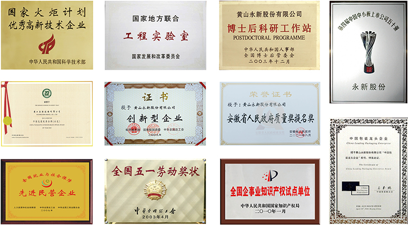 全國五一勞動獎狀;國家創(chuàng)新型企業(yè);中國創(chuàng)新型企業(yè)100強(qiáng);中國包裝龍頭企業(yè);中國包裝優(yōu)秀示范品牌;國家首批資源節(jié)約型環(huán)境友好型試點企業(yè);全國就業(yè)與社會保障先進(jìn)民營企業(yè);國家火炬計劃重點高新技術(shù)企業(yè);中國中小企業(yè)板上市公司50強(qiáng);全國守合同重信用企業(yè);全國先進(jìn)包裝企業(yè);全國企事業(yè)單位知識產(chǎn)權(quán)試點單位;全國輕工業(yè)先進(jìn)卓越績效企業(yè);海關(guān)AA級企業(yè);中國醫(yī)藥包裝優(yōu)秀單位;安徽省人民政府質(zhì)量獎提名獎