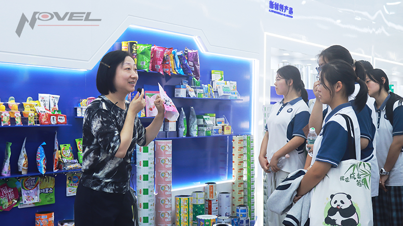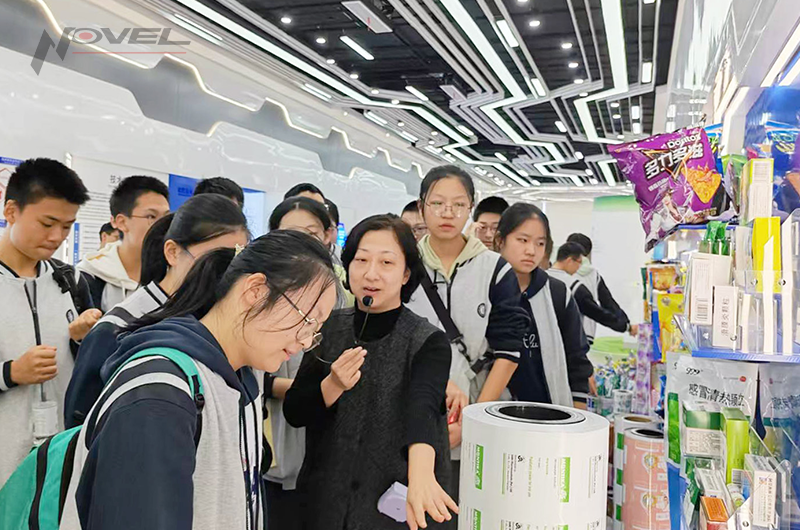 座談結(jié)束,在工作人員的帶領(lǐng)下,研學(xué)團(tuán)隊先后參觀了永新股份展廳和MES系統(tǒng)控制中心。展廳內(nèi),各品類包裝產(chǎn)品、高性能薄膜琳瑯滿目,從食品包裝到工業(yè)應(yīng)用,從環(huán)保材料到智能包裝,工作人員詳細(xì)介紹了產(chǎn)品的研發(fā)過程、性能特點及應(yīng)用領(lǐng)域,讓同學(xué)們直觀感受到包裝材料的多樣“膜”力。MES系統(tǒng)控制中心內(nèi),永新股份信息部經(jīng)理王健與同學(xué)們進(jìn)行互動問答,現(xiàn)代化的智能管理界面實時呈現(xiàn)著生產(chǎn)全流程數(shù)據(jù),同學(xué)們紛紛感嘆工業(yè)智能化帶來的高效與精準(zhǔn)。